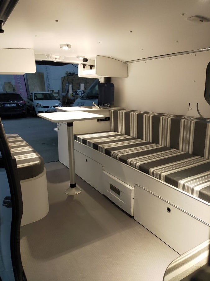 Nous sommes vraiment contents d’avoir procédé par étapes en réalisant d’abord un aménagement simple : avec uniquement la cuisine, le lit et le meuble cuisine puis en testant le van lors d’un court séjour, nous avons pu affiner le projet sans précipitation. Cette méthode permet d’éviter des erreurs coûteuses et de mieux adapter l’aménagement aux besoins réels, au fur et à mesure des découvertes. Car une fois construits les aménagements sont durs voire impossible à modifier, d’où l’importance d’identifier au mieux ses besoins, et pour cela rien de mieux qu’une mise à l’épreuve en situation réelle ! Par exemple on s’interrogeait sur la nécessité de faire installer un toit ouvrant, et il s’est avéré que nous avons trouvé une solution intermédiaire que vous découvrirez par la suite, qui est bien moins coûteuse et tout aussi pratique.