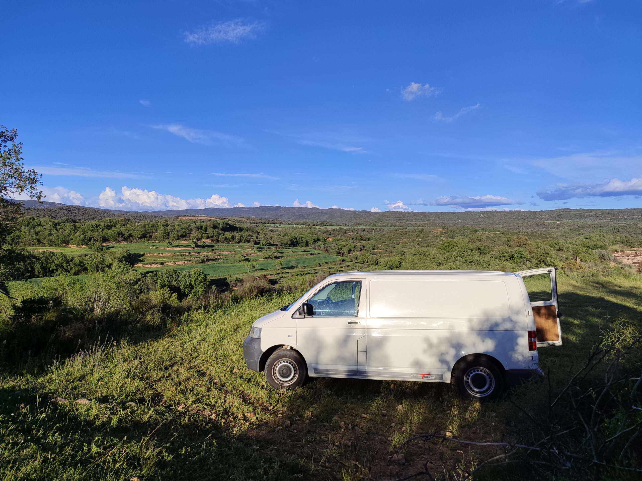 La journée touchant à sa fin, il était temps de trouver un endroit où passer la nuit. L’Espagne semble être un paradis pour cela : une fois sortis des villes, les vastes espaces déserts et les nombreuses petites routes de campagne offrent une multitude de spots. Après avoir suivi une piste en terre menant au sommet d’une colline, nous avons trouvé un endroit parfait : plat, isolé, avec une vue splendide sur les terres environnantes.