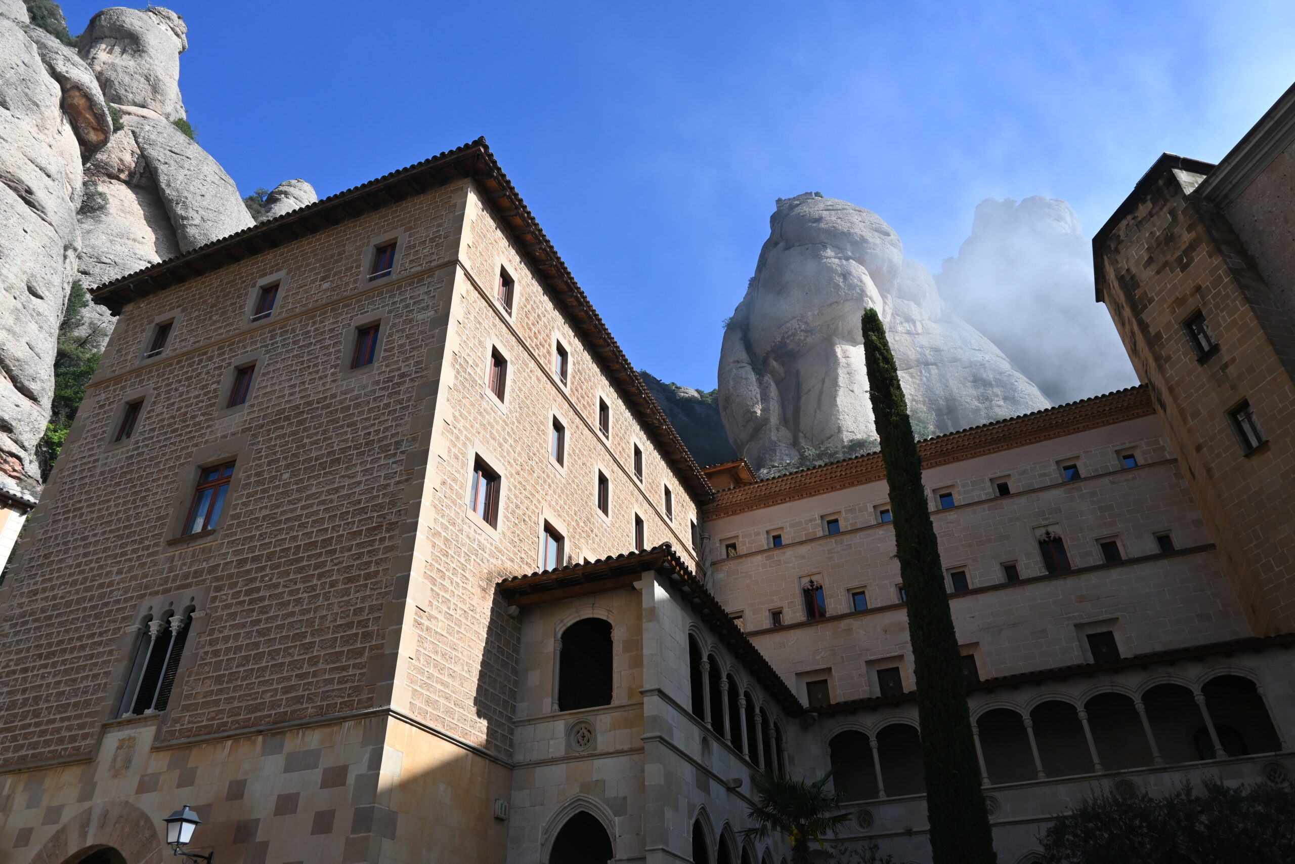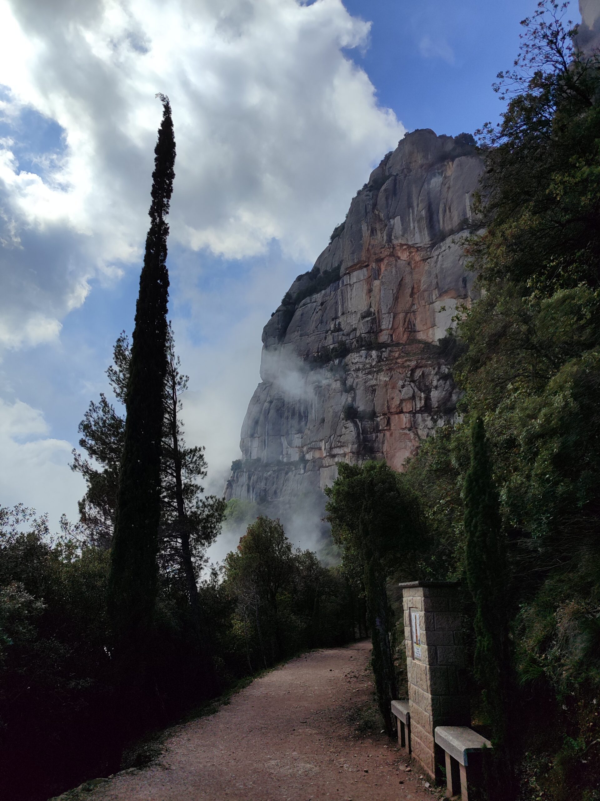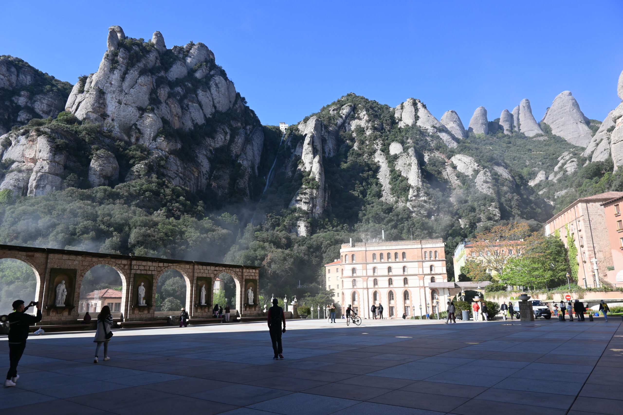 Après avoir pris le temps de flâner sur la place centrale et d’admirer la vue, nous sommes retournés au van pour sortir Ginko et le promener. Montserrat offre de superbes sentiers de randonnée, dont certains permettent d’atteindre le sommet de la montagne pour une vue plongeante sur le monastère. Bien que nous n’ayons pas choisi ce parcours, nous vous le recommandons si vous êtes prêts à faire l’effort ! De notre côté, nous avons emprunté un chemin plus doux, longeant le monastère en direction des rochers. L’endroit était si paisible que nous avons détaché Ginko pour qu’il puisse explorer librement. Le sentier, parsemé de rochers ornés de symboles religieux, offrait une vue imprenable et restait bien ombragé.