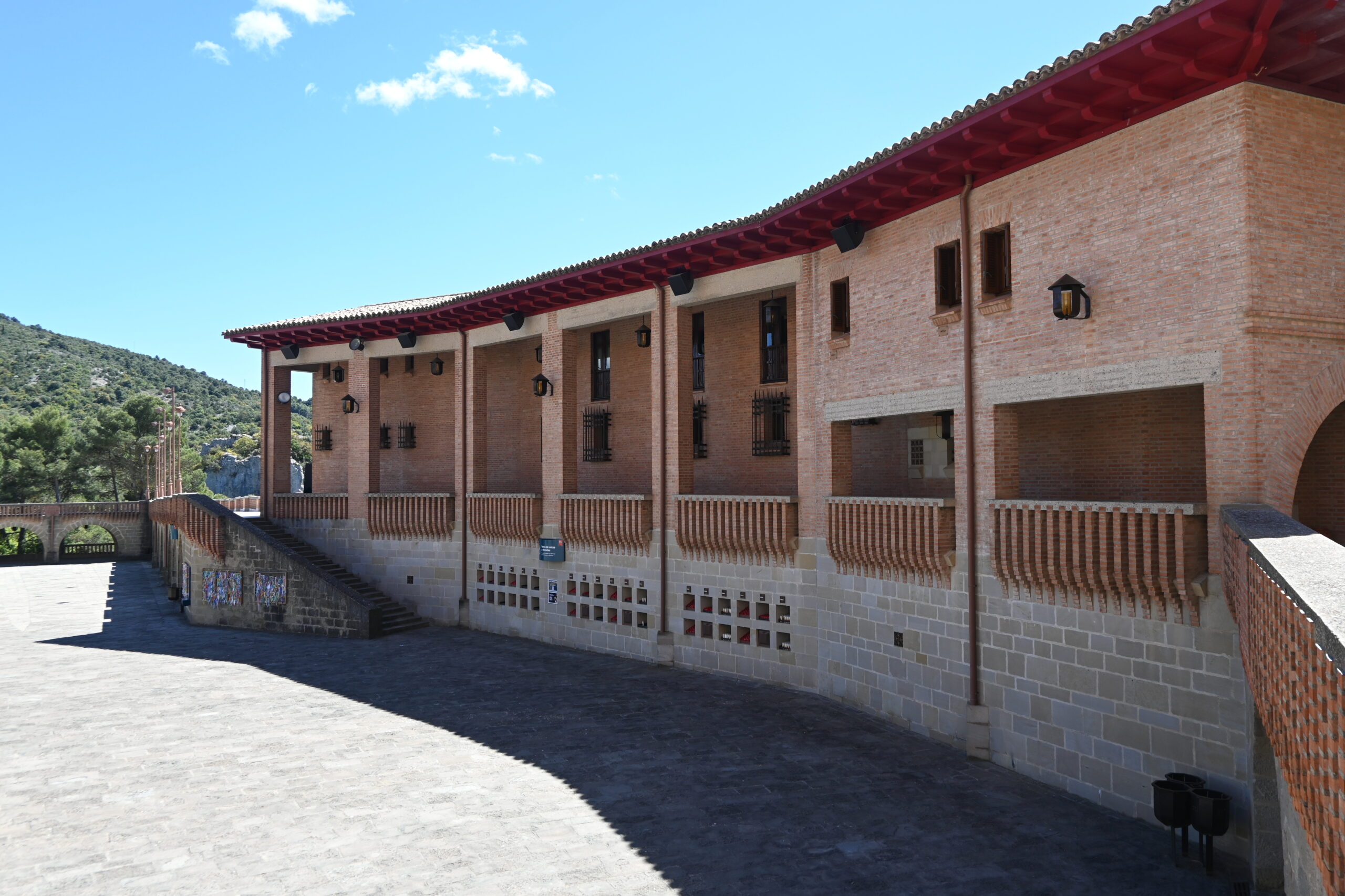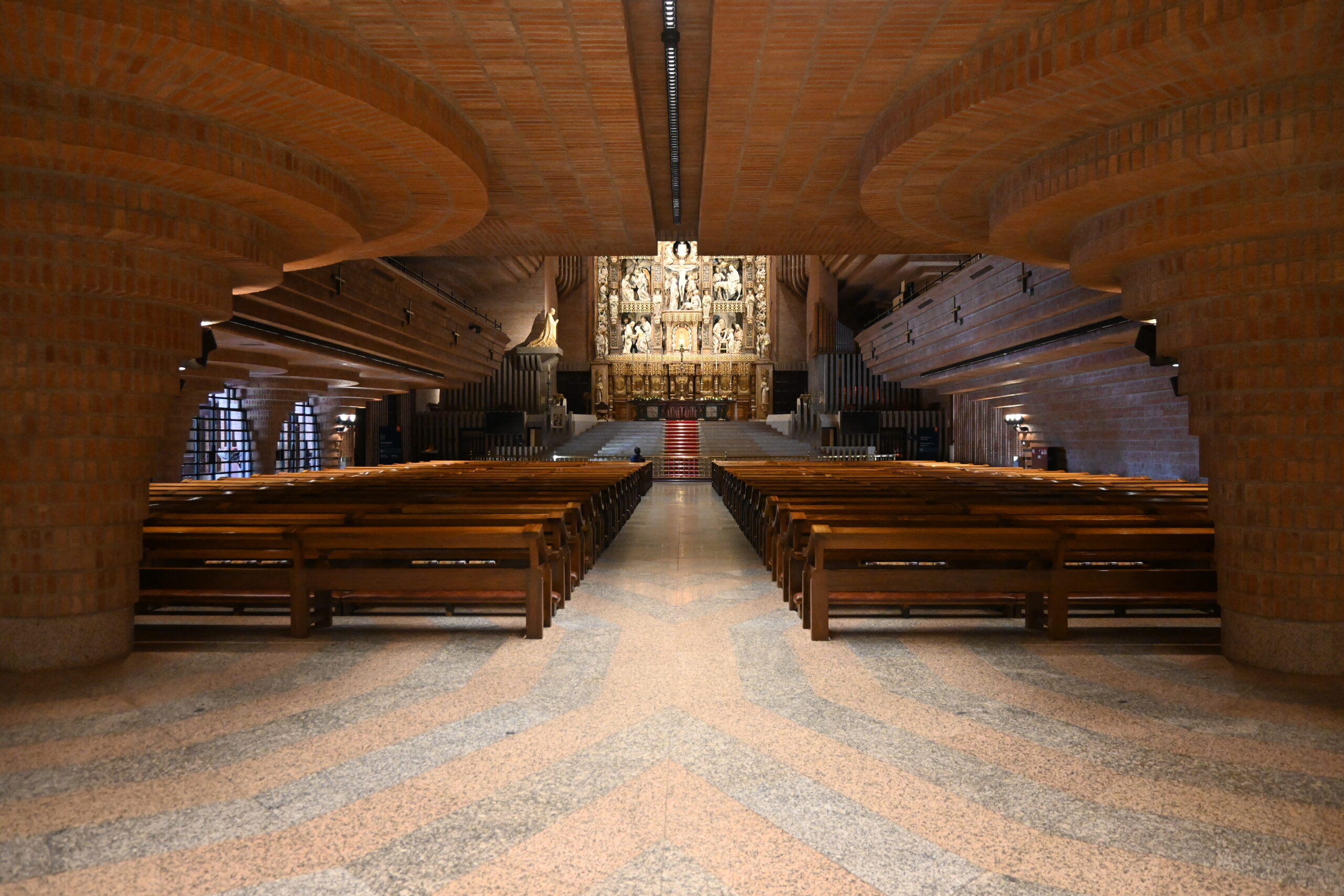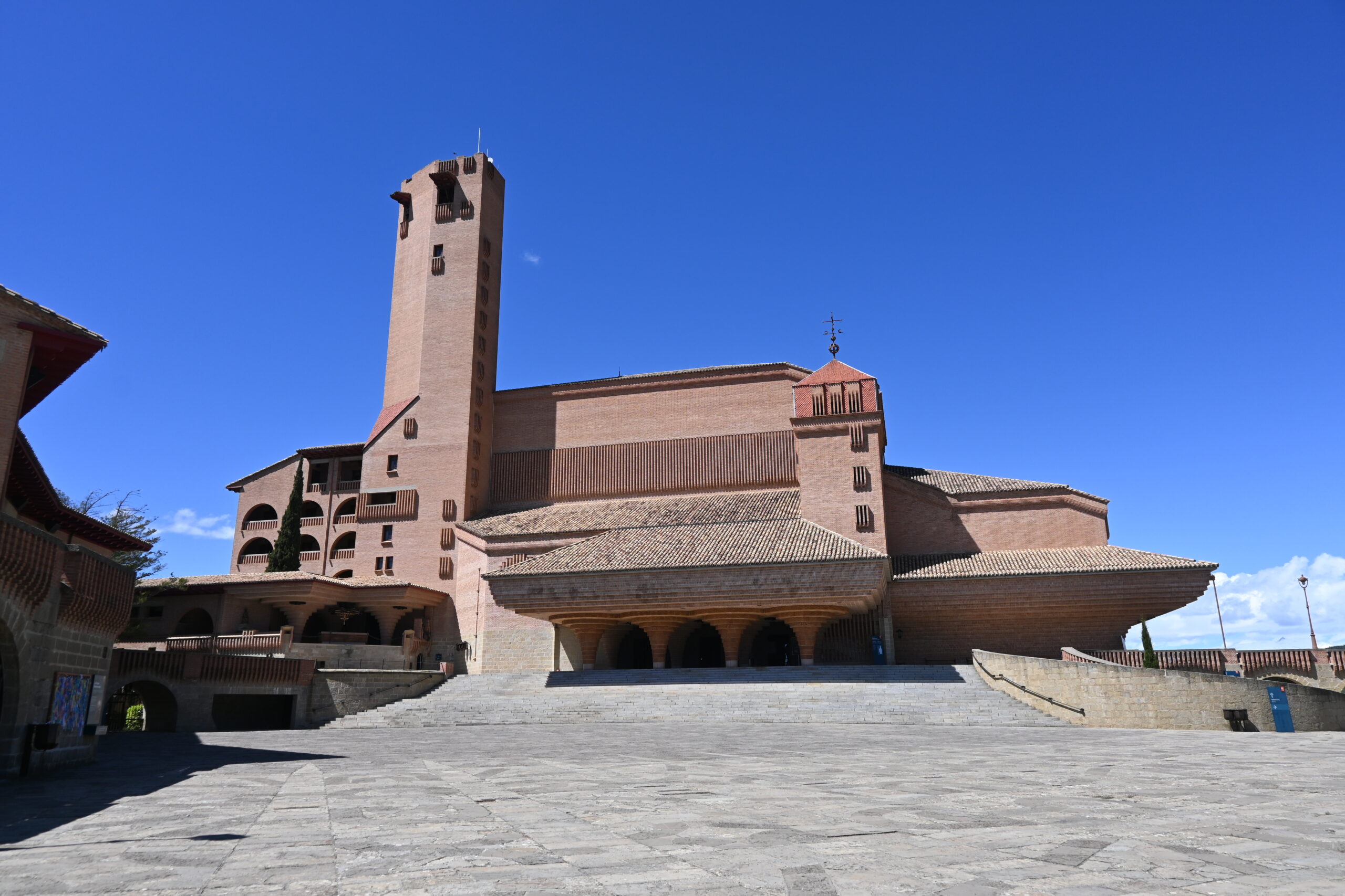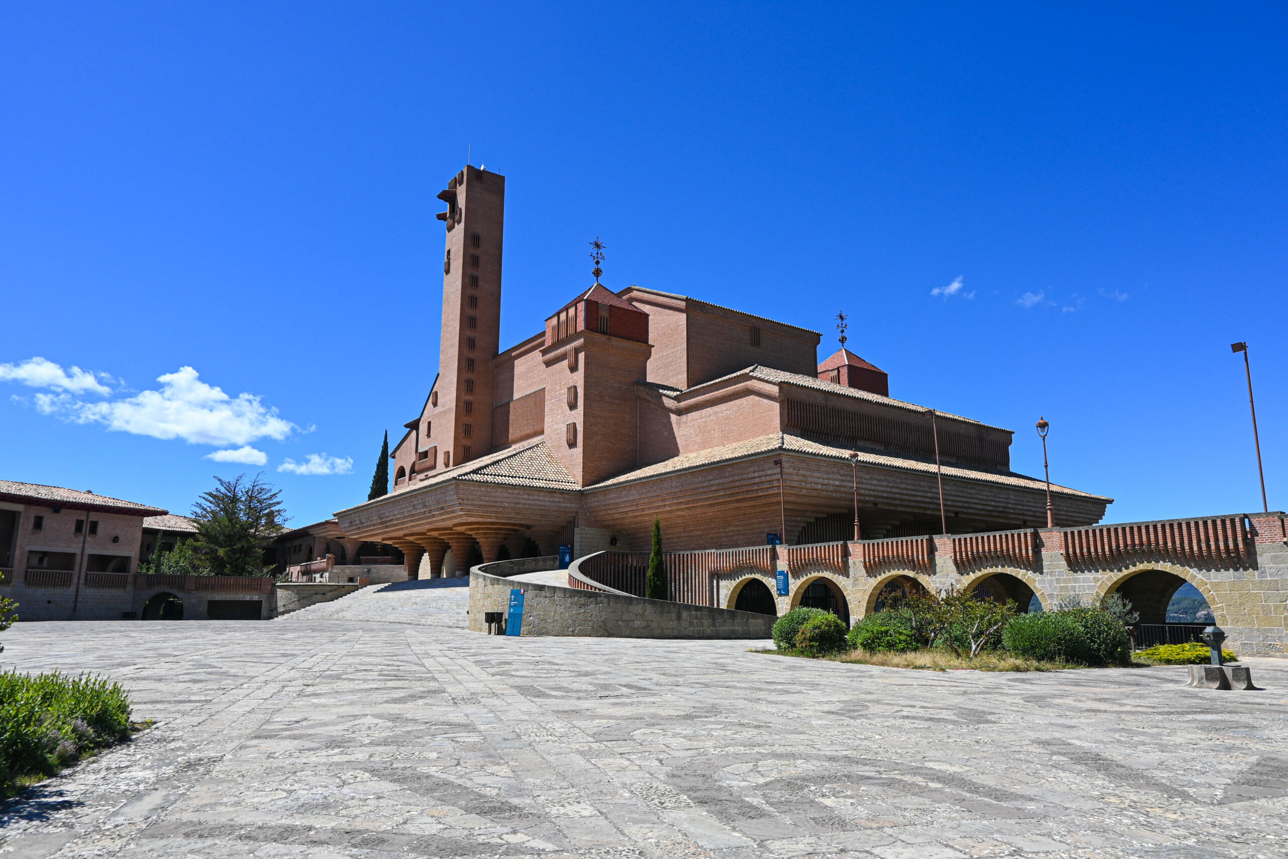 Le ventre plein nous prenons la route pour remonter encore vers le Sanctuaire de Torreciudad, probablement moins cité dans les articles touristiques mais déniché par Anaïs pour son architecture atypique. Une fois arrivé au parking on se rends compte que le site doit quand même accueillir du monde au vu de la taille du parking mais chose étrange encore une fois nous sommes seuls, mais cette fois complètement seuls si bien qu’on a cru un instant que c’était fermé. Mais non, alors nous entrons dans l’enceinte et traversons la grande place centrale complètement vide et silencieuse. Le bâtiment se dévoile à nous, super imposant de par sa taille et sa construction atypique, cela attise notre curiosité et nous nous dirigeons vers l’intérieur. Ce dernier est à la hauteur de l’impression extérieure : imposant ! Le volume est bien plus grand que ce à quoi on pourrait s’attendre et au centre trône un gigantesque autel dédié à la Vierge, on se sent vraiment petit à côté de la grandeur de cette œuvre.