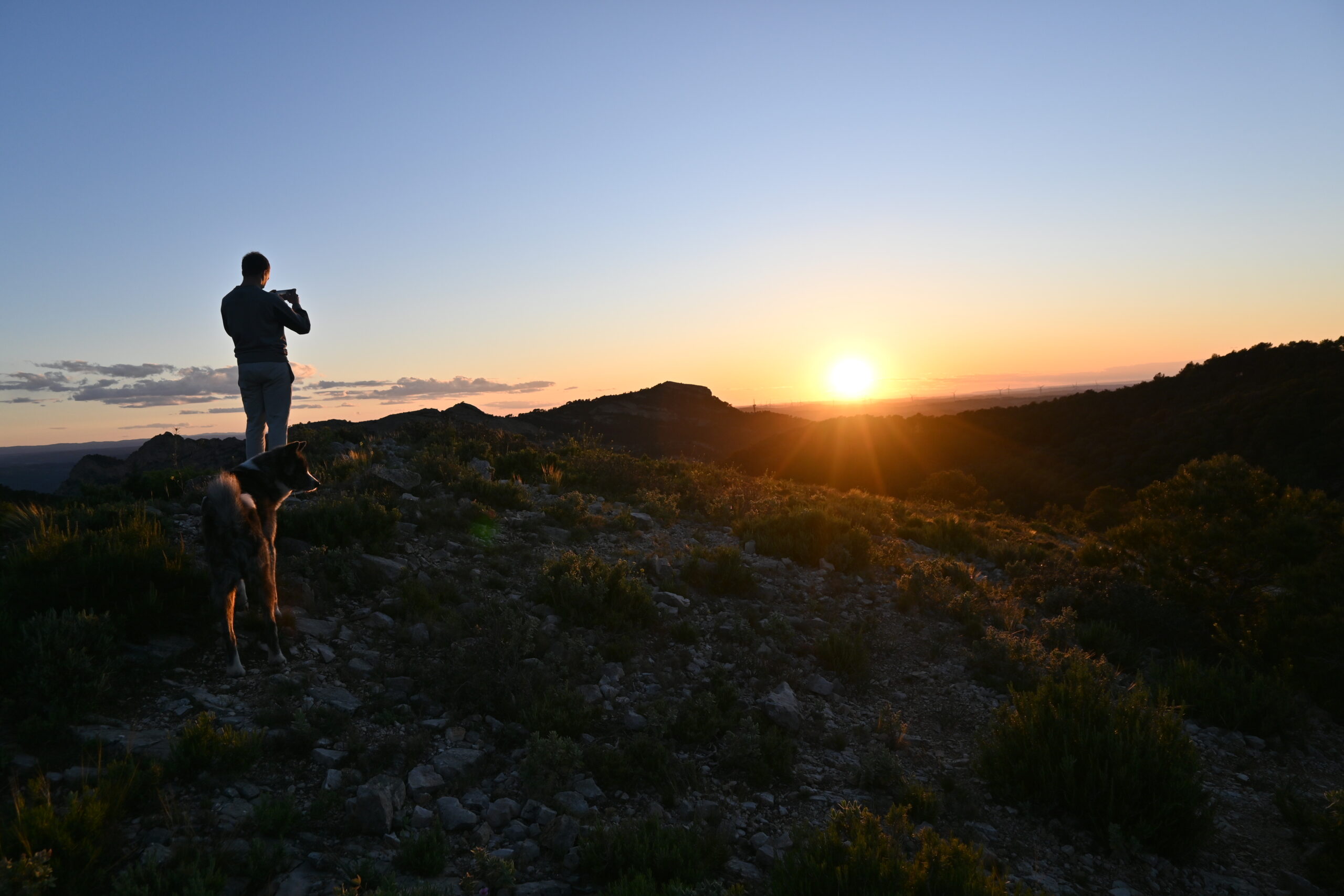 Direction Girona, pour la nuit on repère en route sur Google Maps une route à la périphérie de la ville qui monte sur le relief alentour. On se dit que c’est l’endroit parfait car proche de la prochaine étape mais assez sauvage pour avoir la tranquillité qu’on cherche. Pari réussi, en sortant de la route sur les hauteurs de la ville et en continuant sur une piste en terre on arrive à un endroit plat et arboré. On se gare ici pour la nuit et on prépare à manger, que ce soit au menu barbecue ! C’est un cadeau d’Anaïs à Thomas mais ce petit barbecue de van est parfait : pliable et solide, pile ce qu’il faut pour se faire des barbecues sans avoir à faire de feu de camp assez mal vu des locaux et autorités. Un barbecue est toujours mieux vu et c’est soulageant de pouvoir se préparer à manger sans trop se poser la question de savoir si quelqu’un ou un policier ne va pas venir nous demander d’arrêter sur le champ. Pendant qu’on s’installe, qu’on prend la douche et qu’on prépare le repas, on laisse Ginko faire sa vie librement. C’est aussi pour ça qu’on cherche toujours des endroits tranquilles et loin de tout pour passer la nuit. Déjà on n’est pas dérangé mais en plus on peut lâcher Ginko sans se poser de questions; et quel plaisir de voir son chien profiter autant que nous de cet environnement qui change tous les jours; à l’affût de nouvelles odeurs et de nouveaux territoires à explorer.