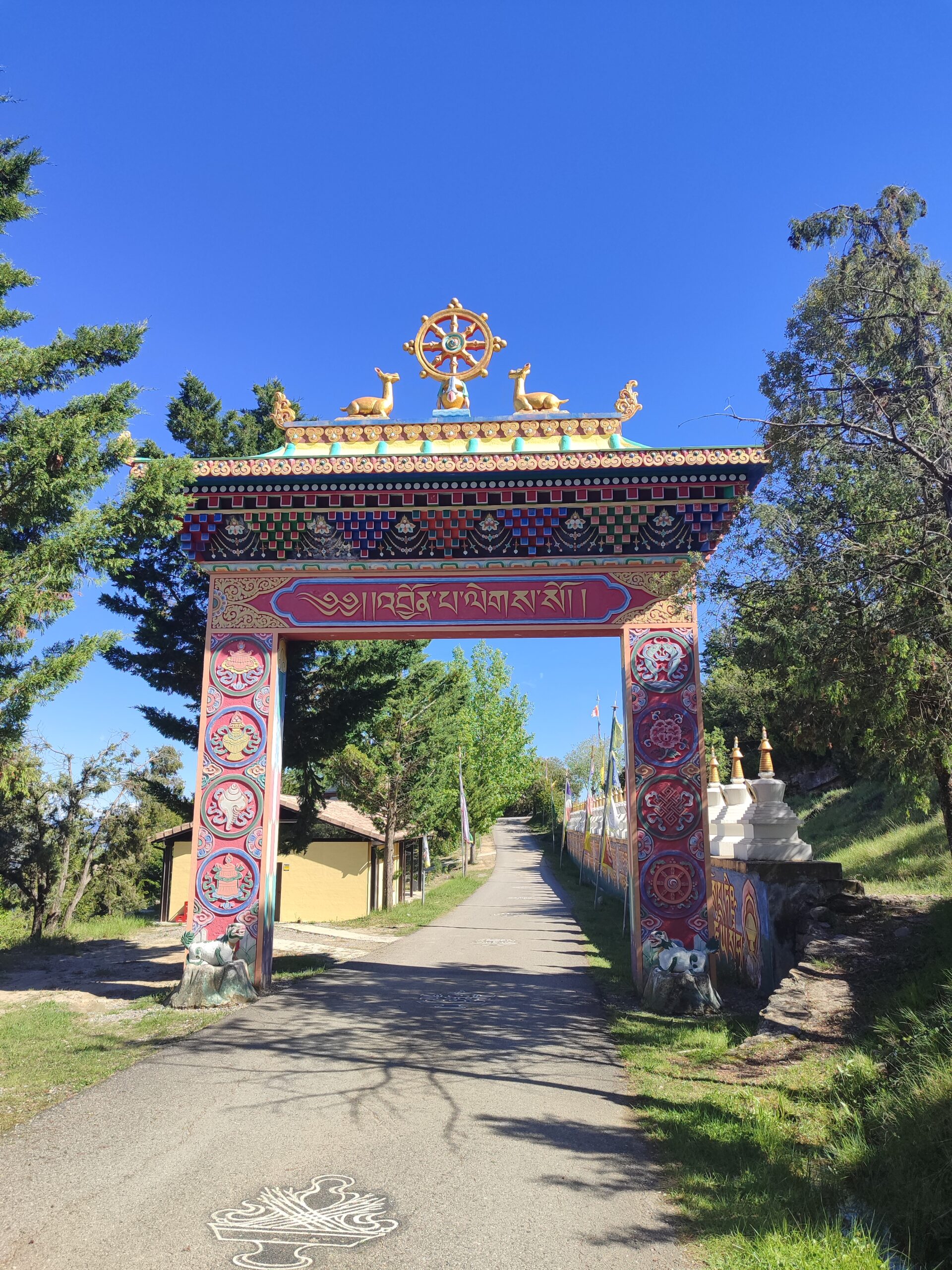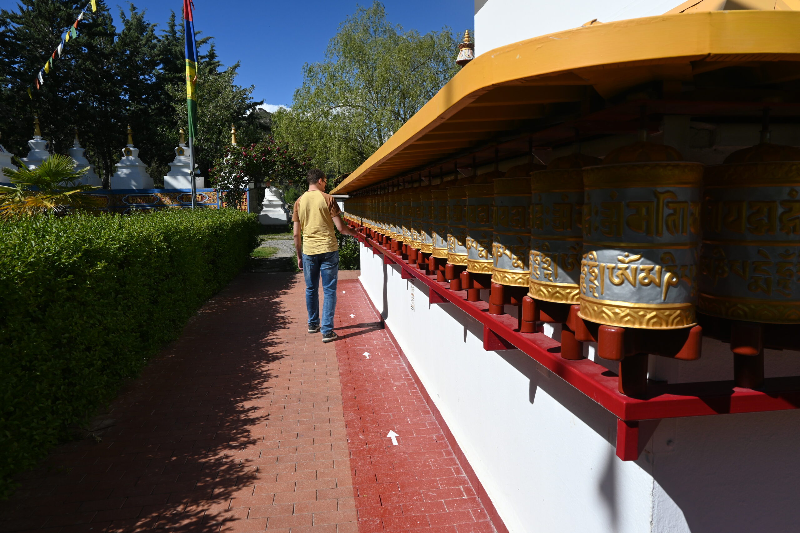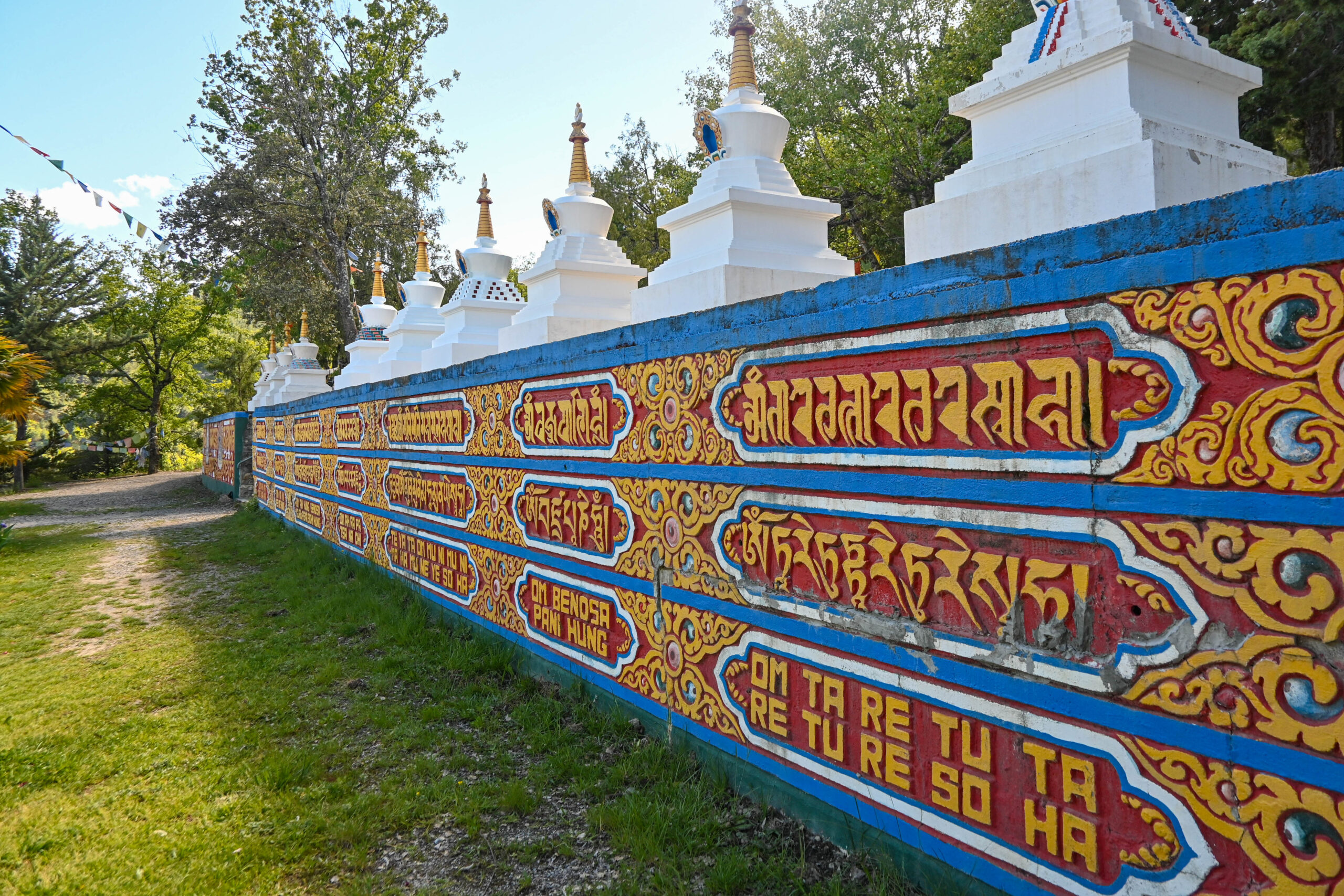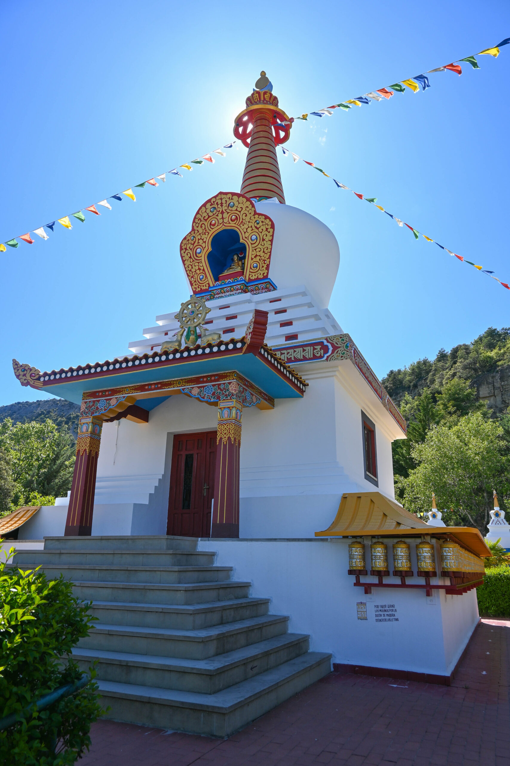 De retour au parking nous repérons une fontaine à eau et on en profite donc pour refaire le plein de nos réserves d’eau, c’est un détail à ne pas louper lors de vos séjours en van : la présence de points d’eau pour refaire le plein avant d’arriver en zone rouge de vos réserves. Le ravitaillement d’eau accompli, nous reprenons la route vers la dernière étape de cette journée : un temple bouddhiste un peu plus loin dans les montagnes. On arrive donc au temple Dag Shang Kagyu, en contrebas d’une route de montagne étroite et peu fréquentée. Le temple était fermé à notre arrivée donc impossible de visiter l’intérieur, mais vu qu’il est plutôt petit ce n’est pas l’objet principal de notre venue. C’est plutôt tout l’extérieur qui est agréable à visiter : toutes les stèles et statues colorées, la petite pagode centrale et ses prières, ou bien le kiosque et ses cierges devant une statue d’une divinité qui nous est inconnue. Tous ces éléments de culture et la tranquillité du site nous transportent momentanément en Asie. Une parenthèse assez courte mais qui change des visites plus classiques de cette région !