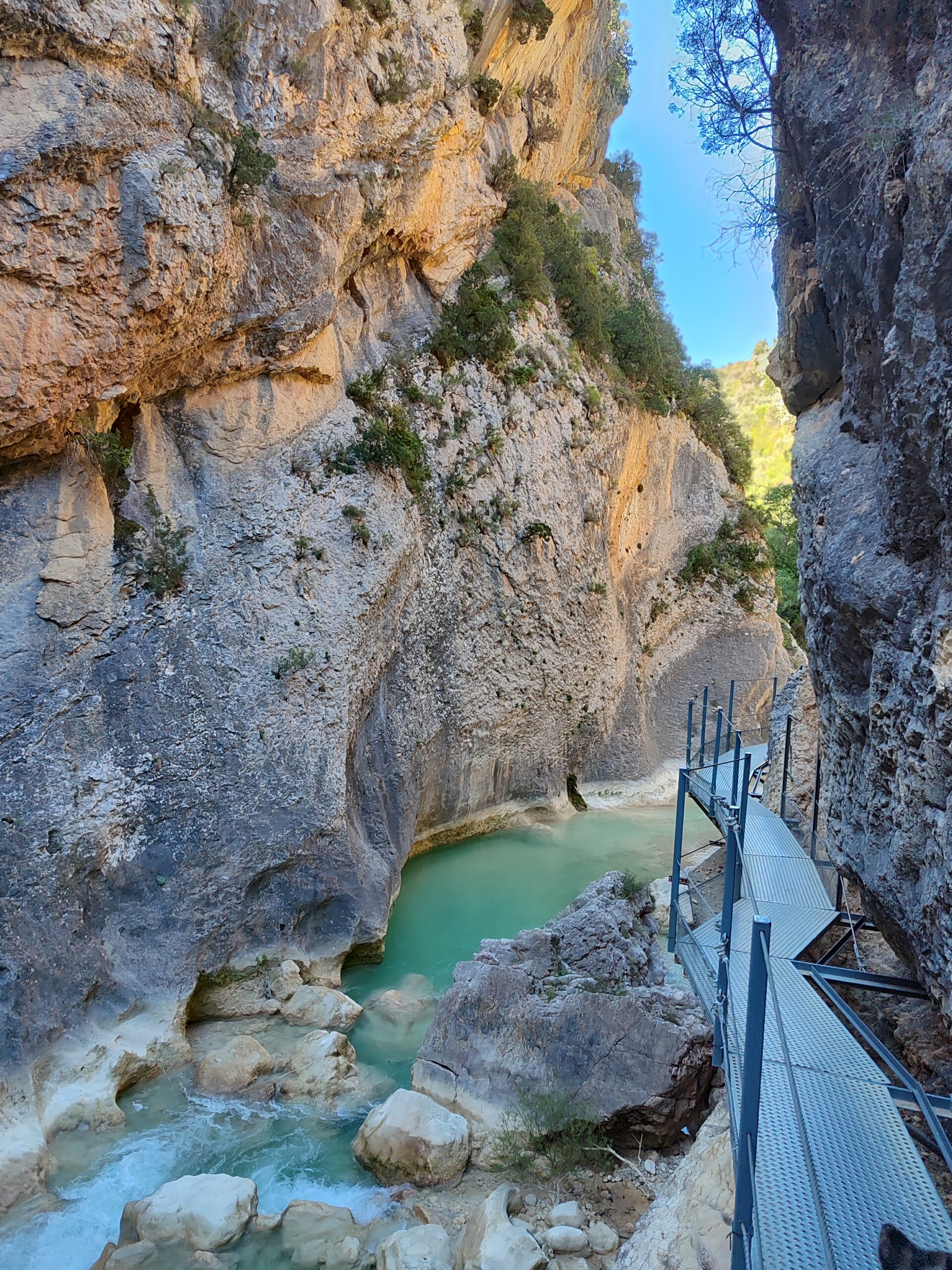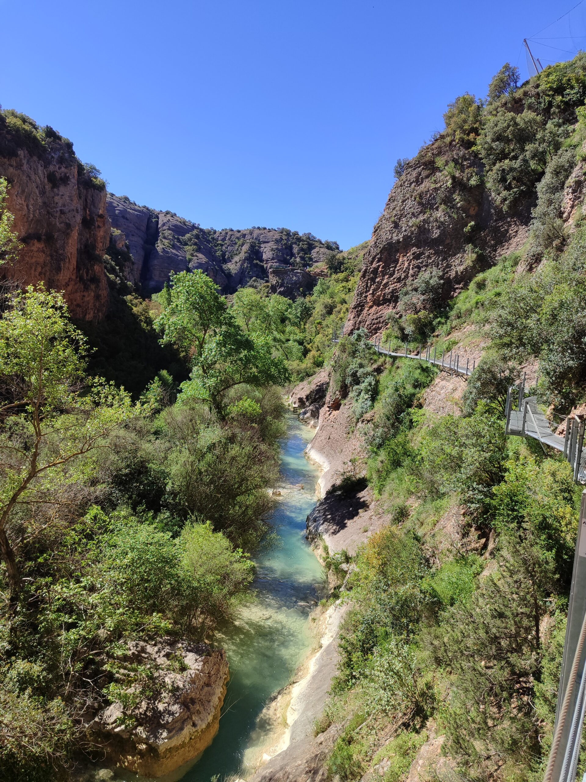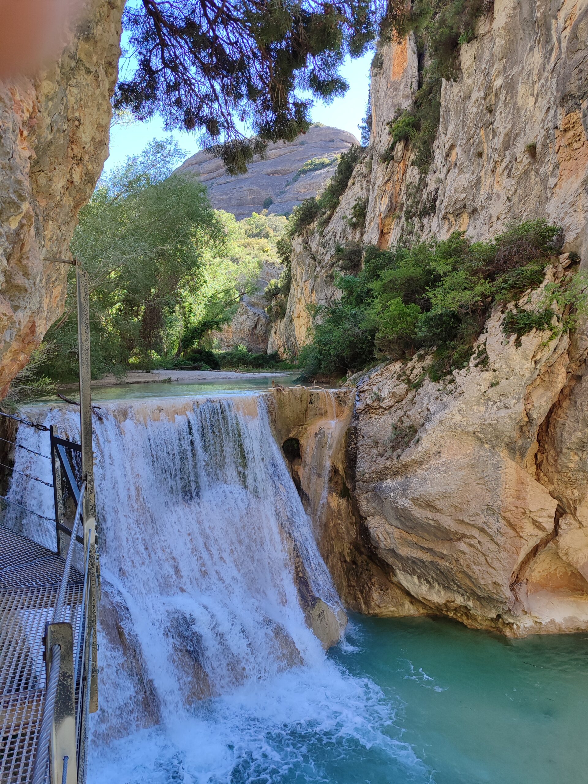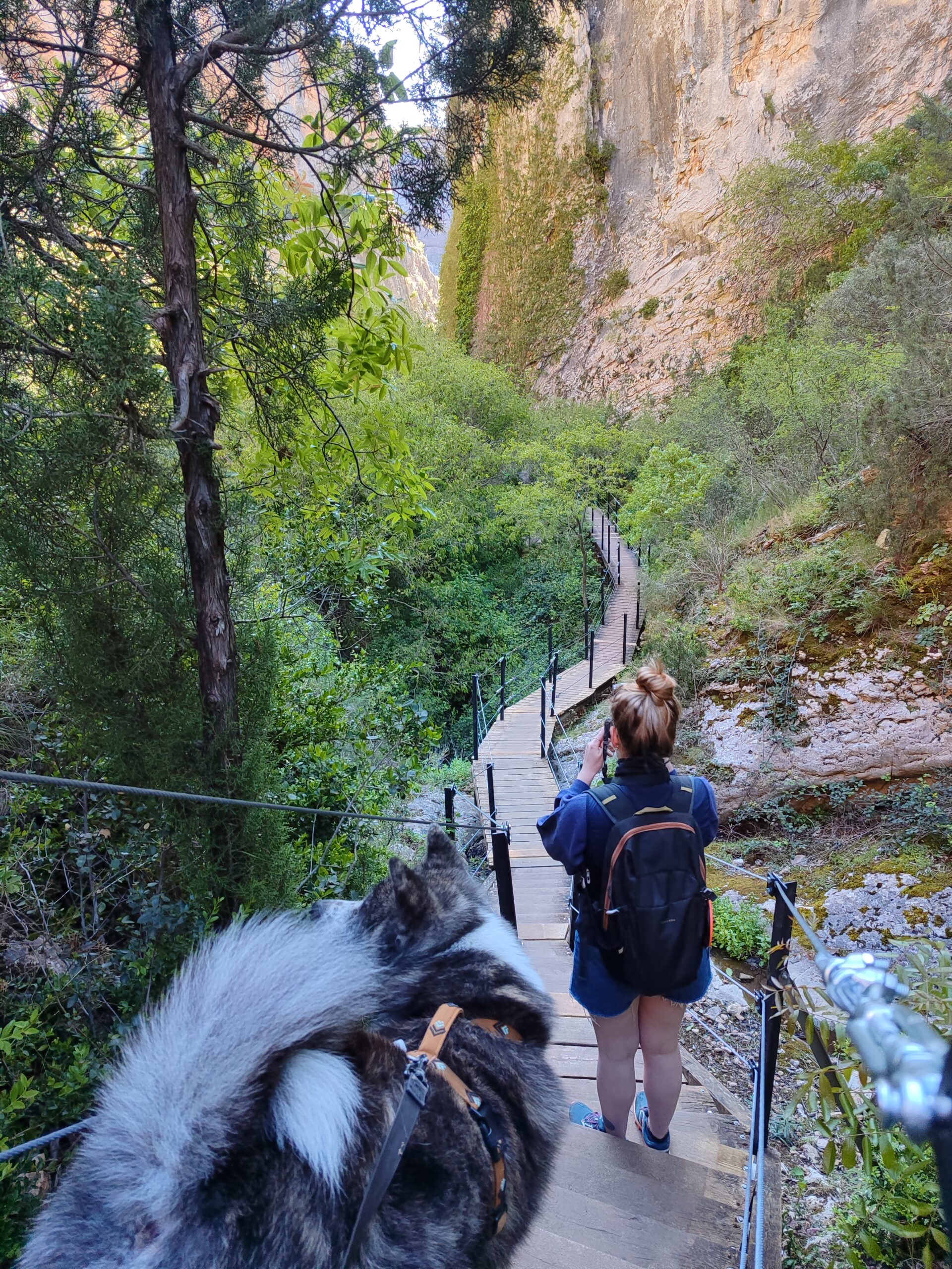 Anaïs s’aventure en première à l’intérieur, car les chiens ne sont pas admis. Elle profite du charme intemporel du cloître roman, tandis que Thomas reste avec Ginko. Malheureusement, lorsque vient son tour, un groupe touristique arrive, rendant la visite impossible pour lui. Qu’à cela ne tienne, la journée se poursuit et alors que les premiers groupes touristiques commencent à peupler les rues nous passons à la seconde grande attraction d’Alquezar : son chemin de passerelle dans les gorges de la Vero. L’accès est payant (5 euros) et géré par la mairie (pensez à prendre vos tickets au point de vente indiqué car l’entrée est contrôlée), ce chemin comportant des sections a passerelles au-dessus du canyon de la Véro commence dans le village d’Alquezar, descends dans les gorges puis remonte de l’autre côté du village. D’une durée de 1h30 et sans difficulté particulière, c’est vraiment un incontournable et il serait dommage de passer à côté. Le cadre est magnifique entre végétation luxuriante et les falaises des gorges, l’eau est d’une clarté rare et le chemin est super bien entretenu. Allez-y vous ne serez pas déçu !