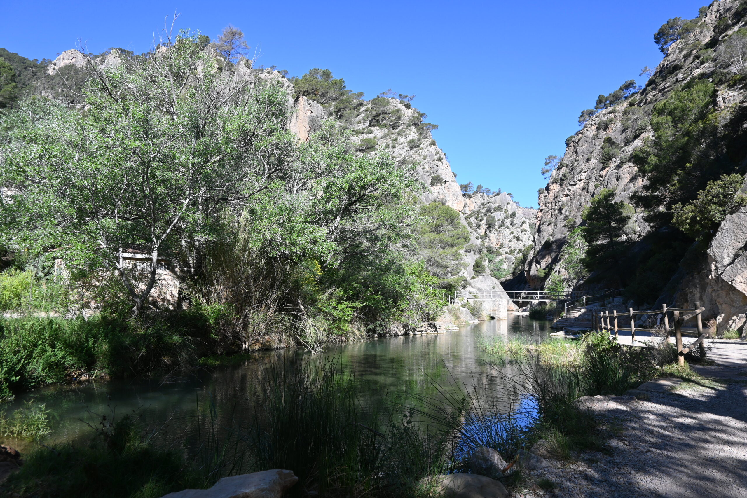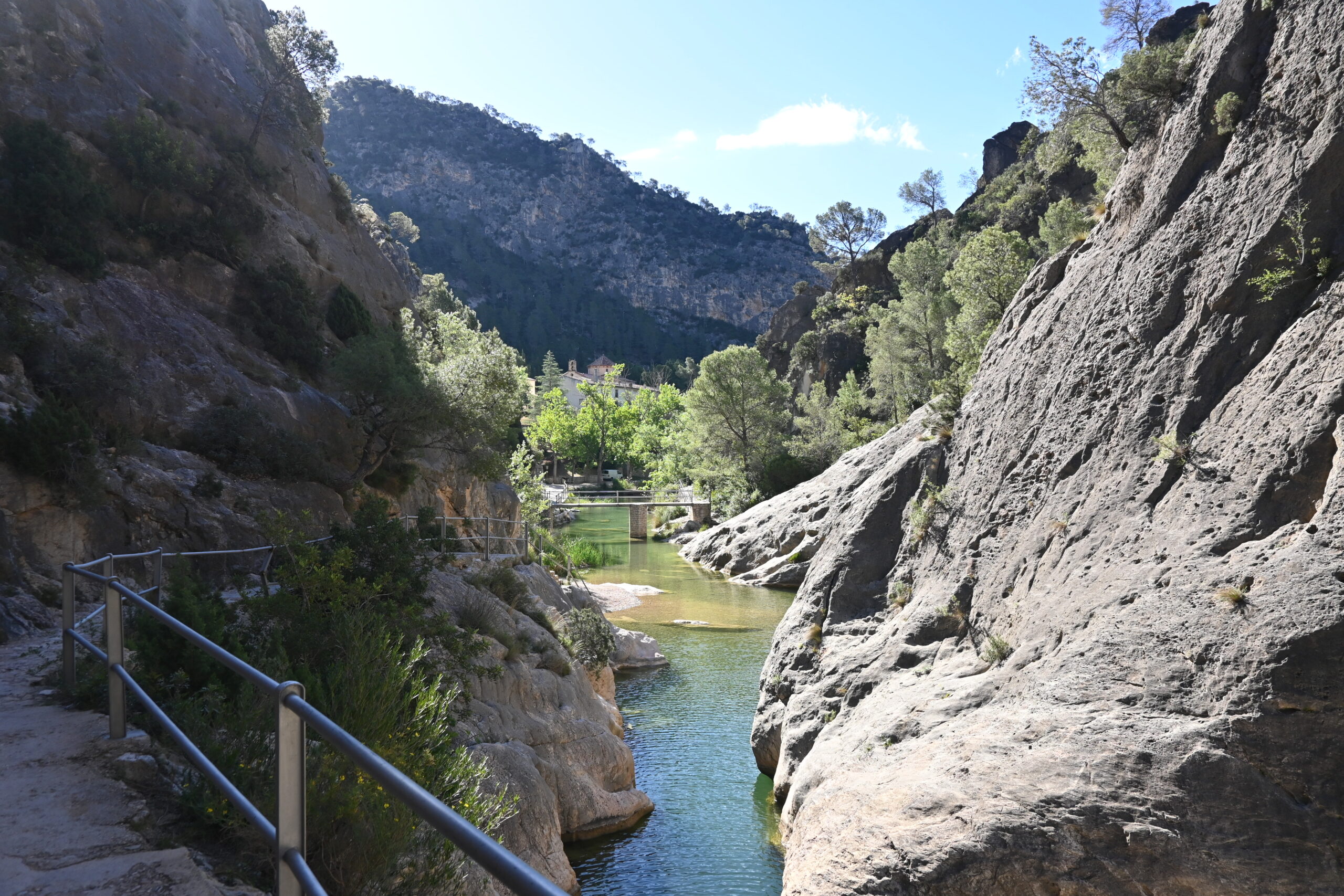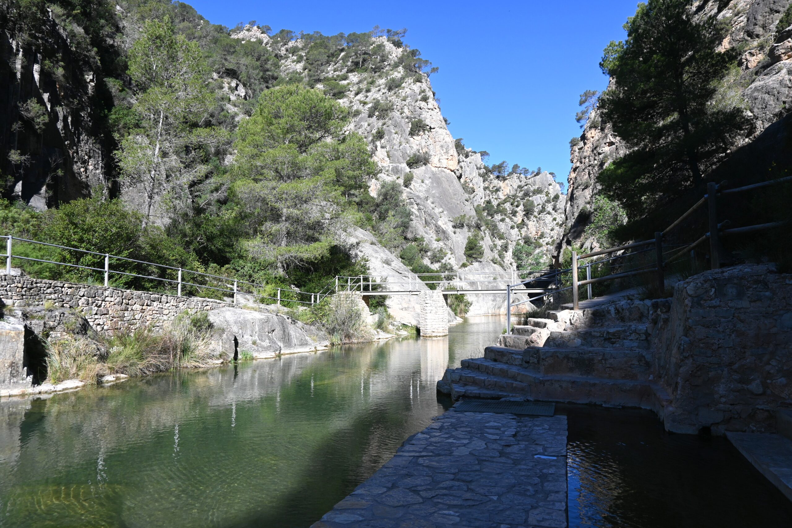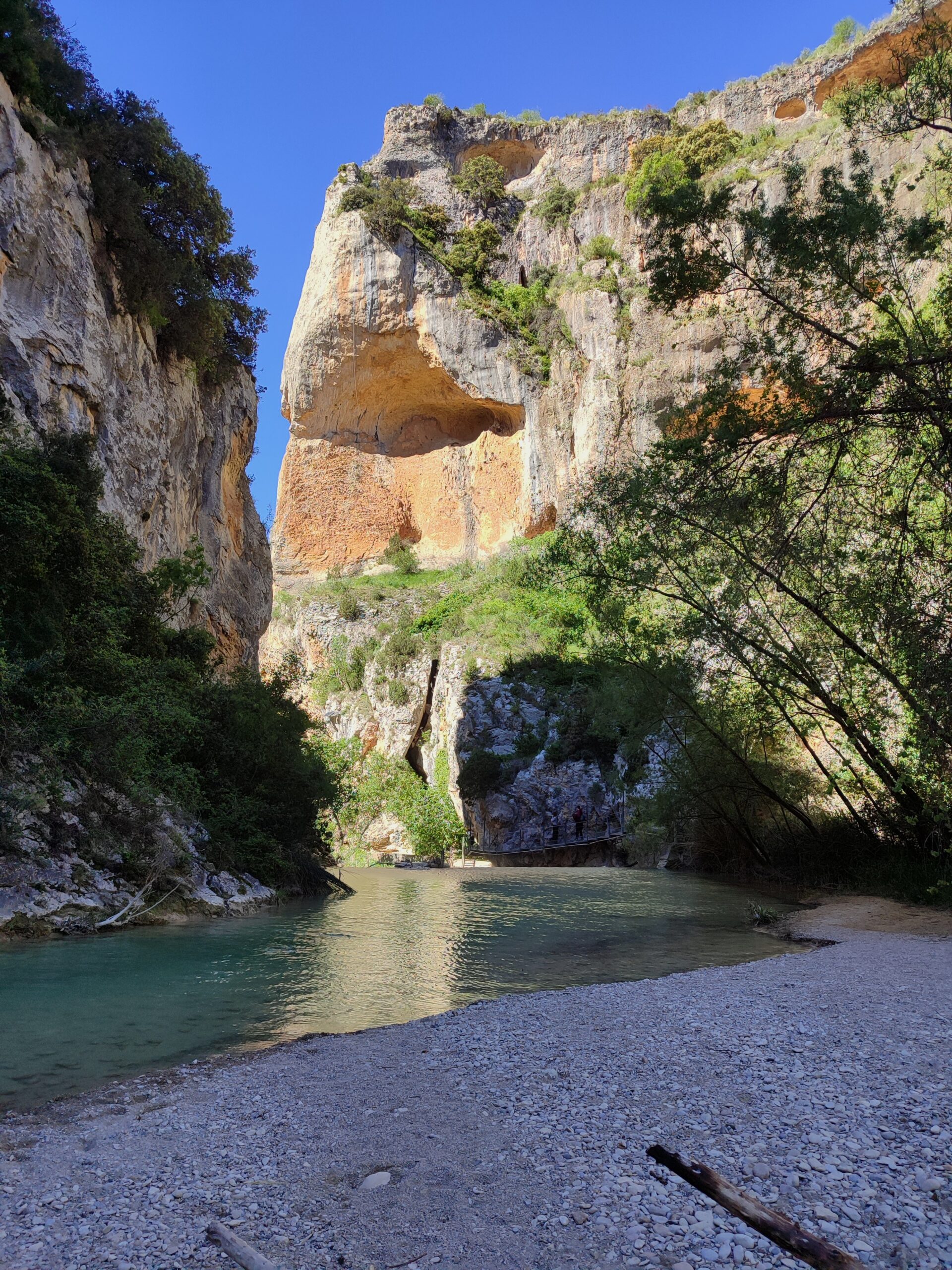 Anaïs s’aventure en première à l’intérieur, car les chiens ne sont pas admis. Elle profite du charme intemporel du cloître roman, tandis que Thomas reste avec Ginko. Malheureusement, lorsque vient son tour, un groupe touristique arrive, rendant la visite impossible pour lui. Qu’à cela ne tienne, la journée se poursuit et alors que les premiers groupes touristiques commencent à peupler les rues nous passons à la seconde grande attraction d’Alquezar : son chemin de passerelle dans les gorges de la Vero. L’accès est payant (5 euros) et géré par la mairie (pensez à prendre vos tickets au point de vente indiqué car l’entrée est contrôlée), ce chemin comportant des sections a passerelles au-dessus du canyon de la Véro commence dans le village d’Alquezar, descends dans les gorges puis remonte de l’autre côté du village. D’une durée de 1h30 et sans difficulté particulière, c’est vraiment un incontournable et il serait dommage de passer à côté. Le cadre est magnifique entre végétation luxuriante et les falaises des gorges, l’eau est d’une clarté rare et le chemin est super bien entretenu. Allez-y vous ne serez pas déçu !