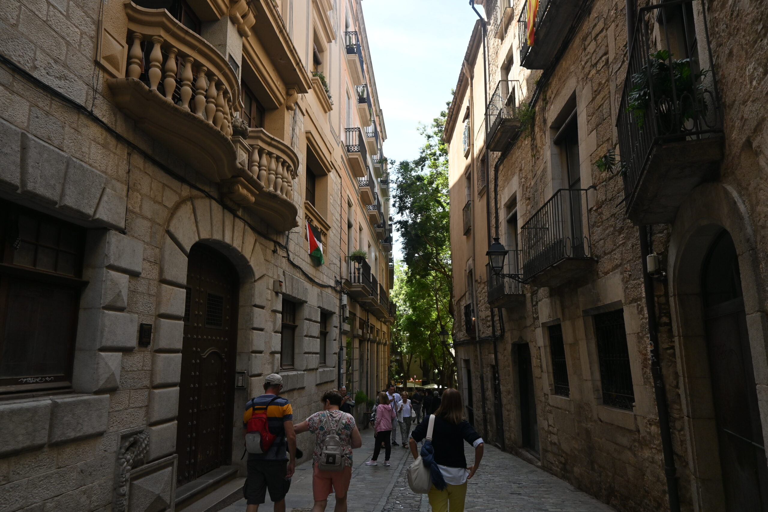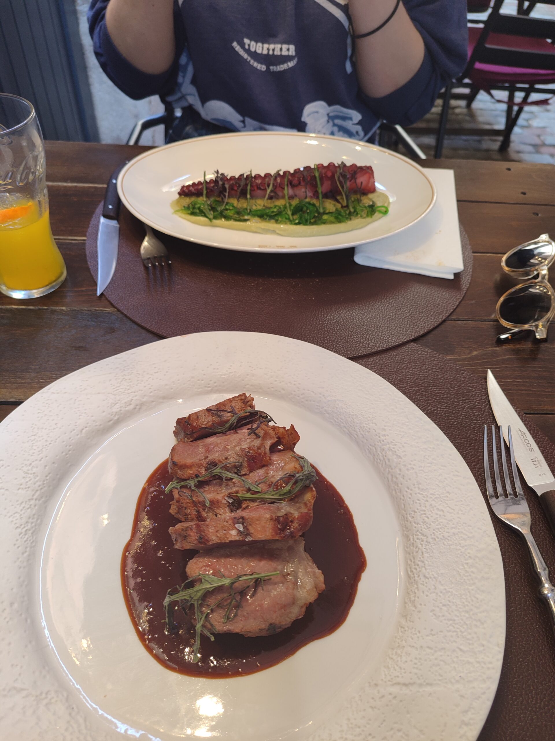 On finit le peu de route qui nous séparait de Girona et on commence la visite. Cette ville surnommée “La ville au Quatre Fleuve” est comme son nom l’indique à l’intersection de 4 fleuves, dont un coupe la ville en deux. La ville est donc construite de part et d’autre de ce dernier, ce qui lui donne une esthétique vraiment magnifique avec ses bâtiments colorés surplombants le fleuve. Pour passer d’un coté à l’autre il y a plusieurs ponts de style différents. On emprunte le pont Eiffel, construit par Gustave Eiffel en personne, et on continue la visite. Girona est aussi une ville de taille moyenne, dans le style traditionnel catalan, des rues bordées de bâtiments colorés. Pour le midi notre choix se porte sur le restaurant Cipresaia, un restaurant plutôt haut de gamme, on se décide à tester un peu la cuisine fine locale. Anaïs prend un tentacule de poulpe braisé et Thomas un gigot d’agneau en sauce. Les deux plats ont été la hauteur de nos attentes : un régal !