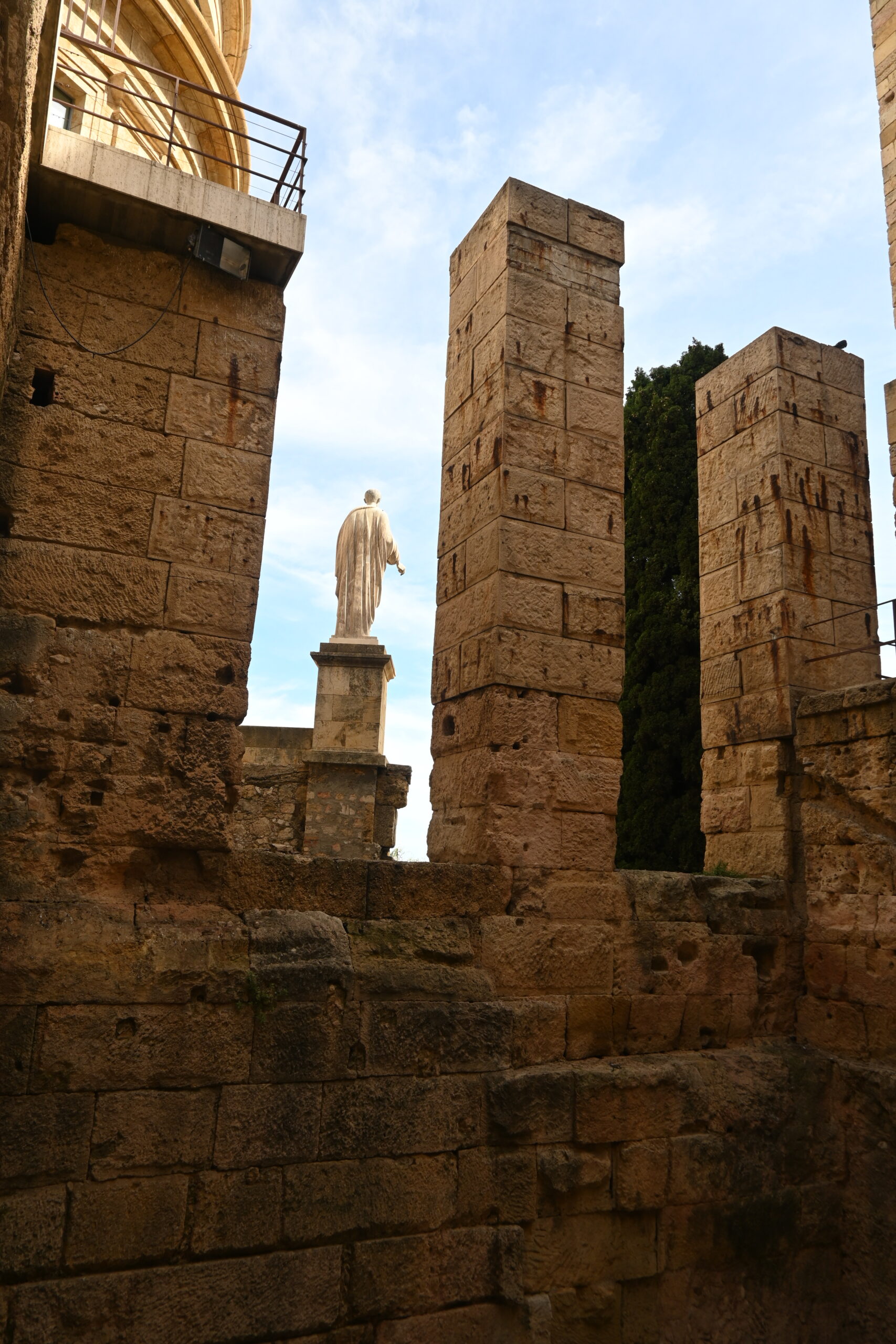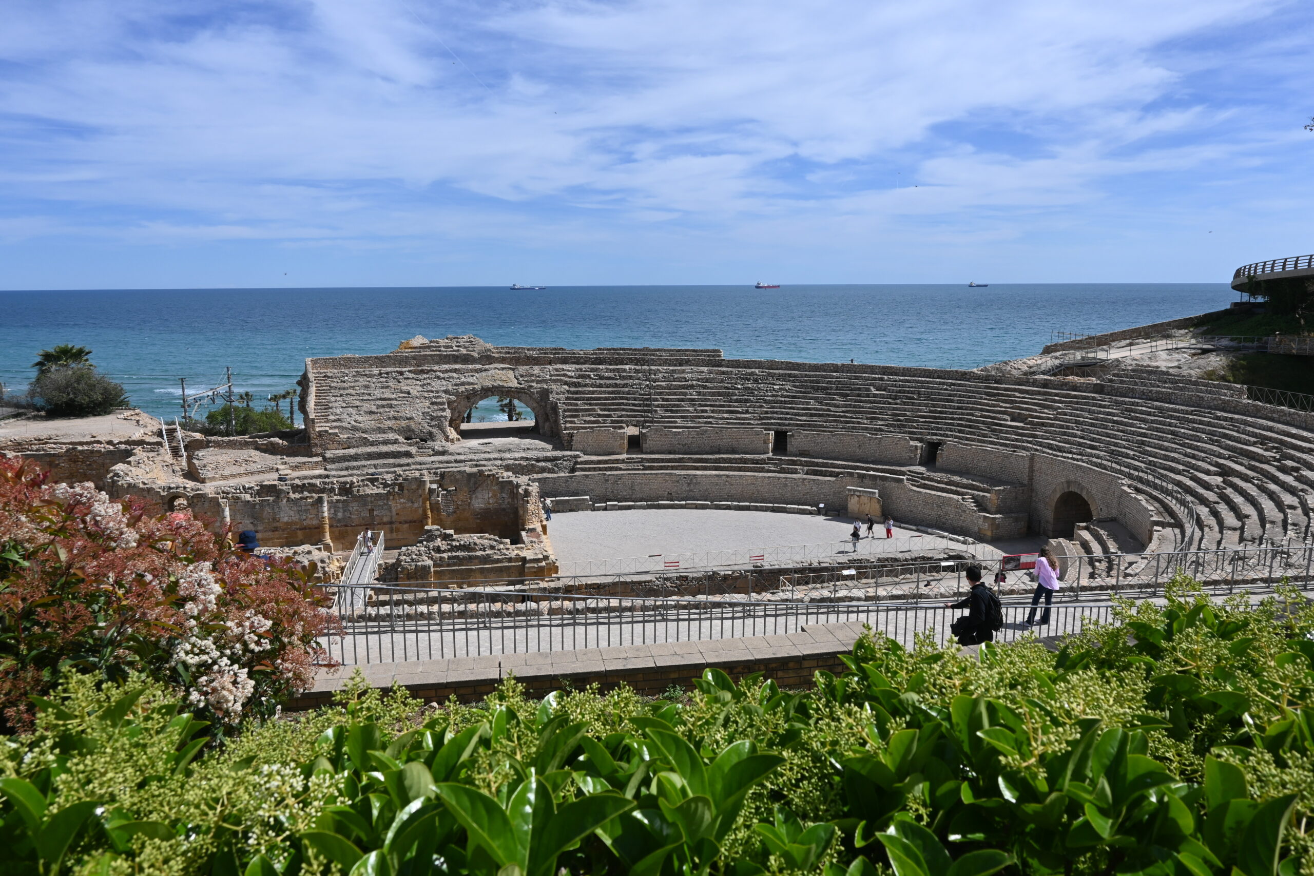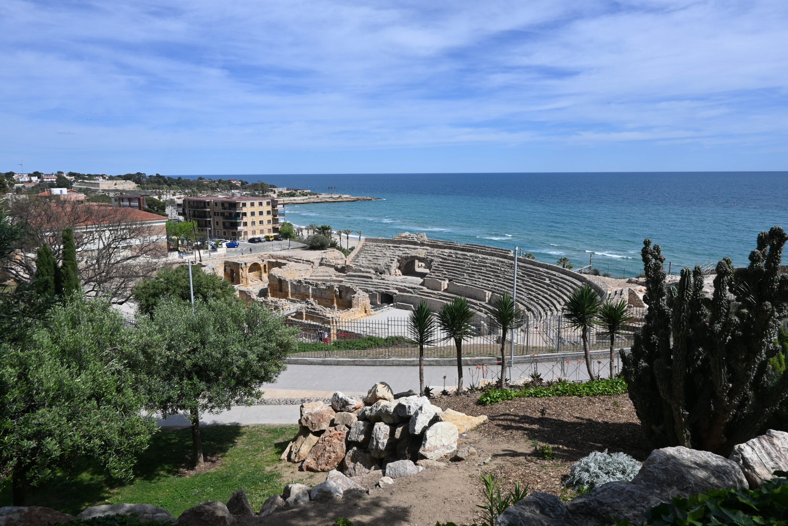 Après cette baignade matinale nous prenons la route vers Tarragone, on se gare dans un parking souterrain en centre-ville, dont la sortie piéton donne sur la place du Mercato Central de Tarragona, un marché couvert. On décide de rentrer pour y faire un tour et acheter un peu de charcuterie locale pour les apéros du soir, nous trouvons bien évidemment ce que nous cherchions : du jambon ibérique qui a l’air délicieux et bien affiné ! En ressortant nous commençons la vraie visite de Tarragone. C’est une ville de taille moyenne dont l’origine remonte à l’empire romain; et cela se ressent dans le nombre de vestiges et de bâtiments de cette époque répartis dans toute la ville, et aussi évidemment de par la présence d’un bel amphithéâtre placé avec goût à proximité de la mer, offrant une magnifique vue depuis sa partie haute. Cette installation est l’incontournable de la ville, il y a une visite payante qui permet de le parcourir de l’intérieur mais aussi un accès gratuit par un parc aménagé au-dessus, qui permet d’observer le site depuis le haut, ce qui nous a suffi pour le temps imparti que nous avons pour visiter la ville.